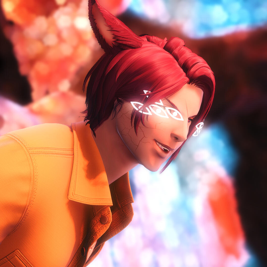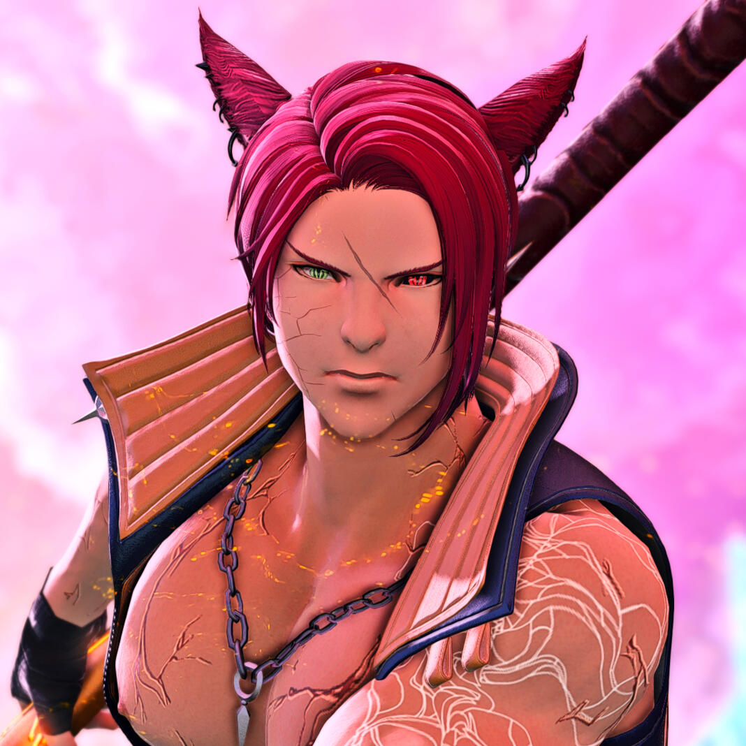 A clanless Miqo'te roaming this realm with no rhyme or reason; he simple goes where the wind takes him; the king of mischief does what he pleases.A little twitchy in nature, ears moving and tail swishing - something seems to be a little off with this Miqo'te, and it's hard to put you're finger on exactly why when you meet him. But the feeling is there, lingering.Rolanberry red hair, and a mismatched gaze stare back at you. One green eye, the other blood red with blackened sclera, catching the light with an odd spark.Built strong, but more lean as Miqo'te usually are, behind him sways a bushy tail that isn't as well kept as it could be. Fractured skin, like cracked stone, litters his form beneath colorful cloth - splitting through swirling white lines down his left hand side.Often clothed in bright yellow and black, from a distance he may seem like a friendly and approachable person; though approaching him may leave your day a little less brighter than before if you choose to do so. Mischievous and bastard like behavior might leave a sour taste in your mouth after meeting him.