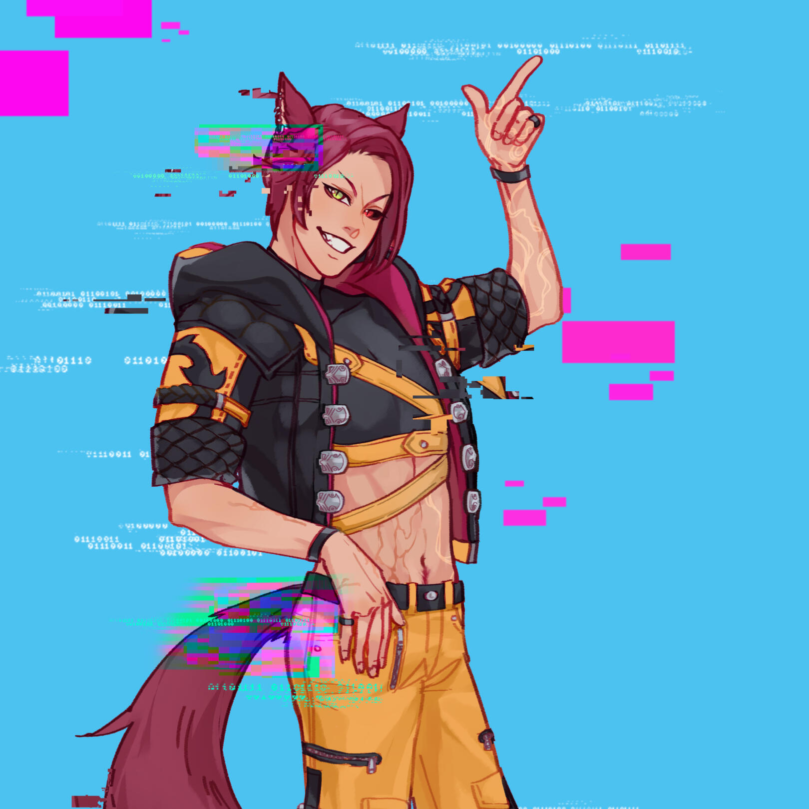 A clanless Miqo'te roaming this realm with no rhyme or reason; he simple goes where the wind takes him; the king of mischief does what he pleases.A little twitchy in nature, ears moving and tail swishing - something seems to be a little off with this Miqo'te, and it's hard to put you're finger on exactly why when you meet him. But the feeling is there, lingering.Rolanberry red hair, and a mismatched gaze stare back at you. One green eye, the other blood red with blackened sclera, catching the light with an odd spark.Built strong, but more lean as Miqo'te usually are, behind him sways a bushy tail that isn't as well kept as it could be. Fractured skin, like cracked stone, litters his form beneath colorful cloth - splitting through swirling white lines down his left hand side.Often clothed in bright yellow and black, from a distance he may seem like a friendly and approachable person; though approaching him may leave your day a little less brighter than before if you choose to do so. Mischievous and bastard like behavior might leave a sour taste in your mouth after meeting him.